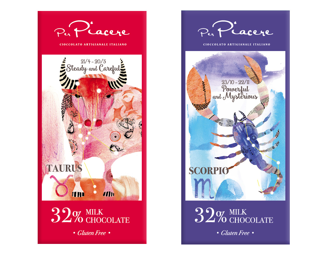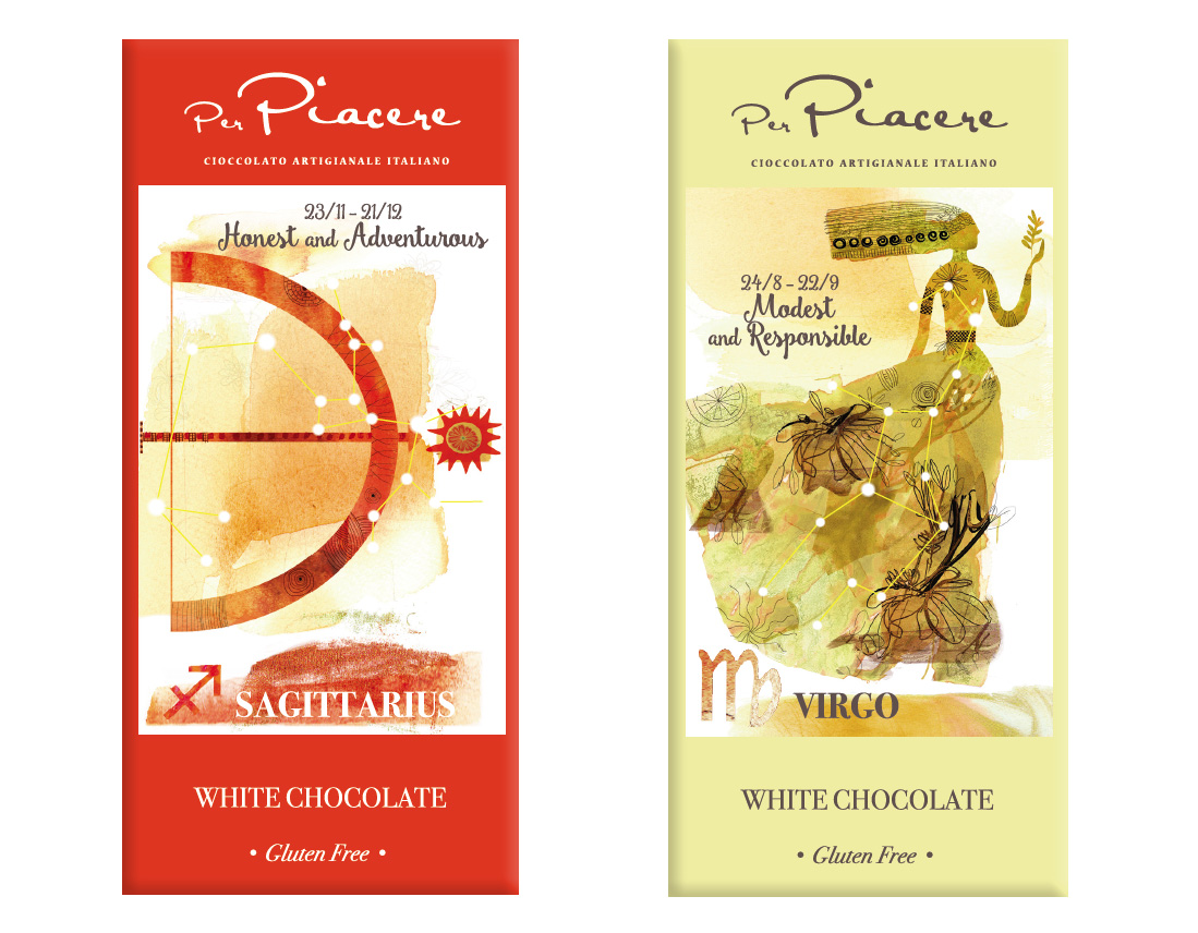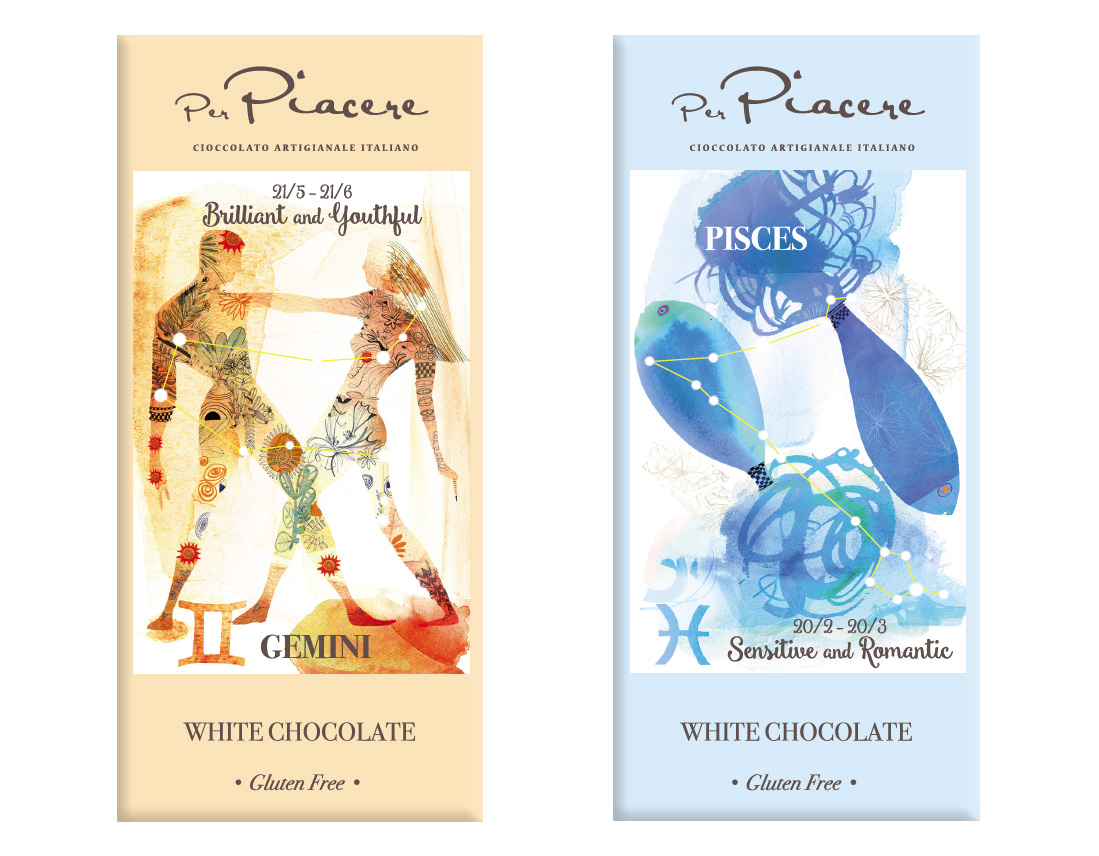 Per il packaging delle tavolette di cioccolato, destinate a una catena di supermercati di lusso nel mercato cinese, abbiamo scelto il tema dei segni zodiacali sapientemente illustrati dalla bravissima Alessandra Scandella.
