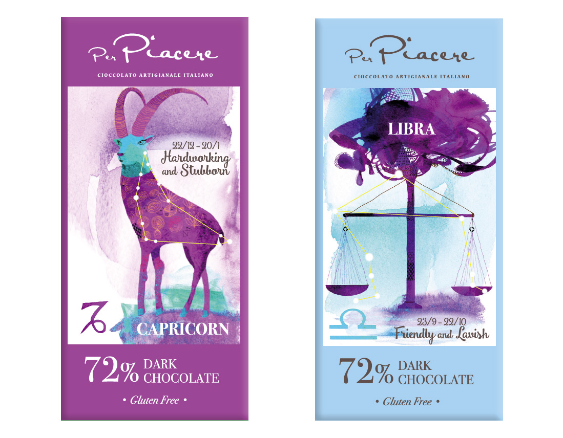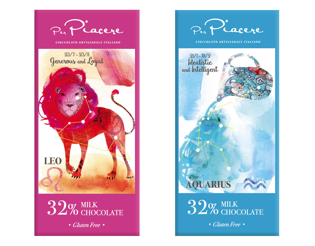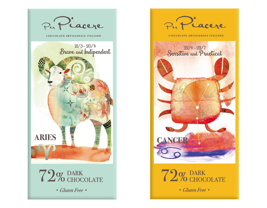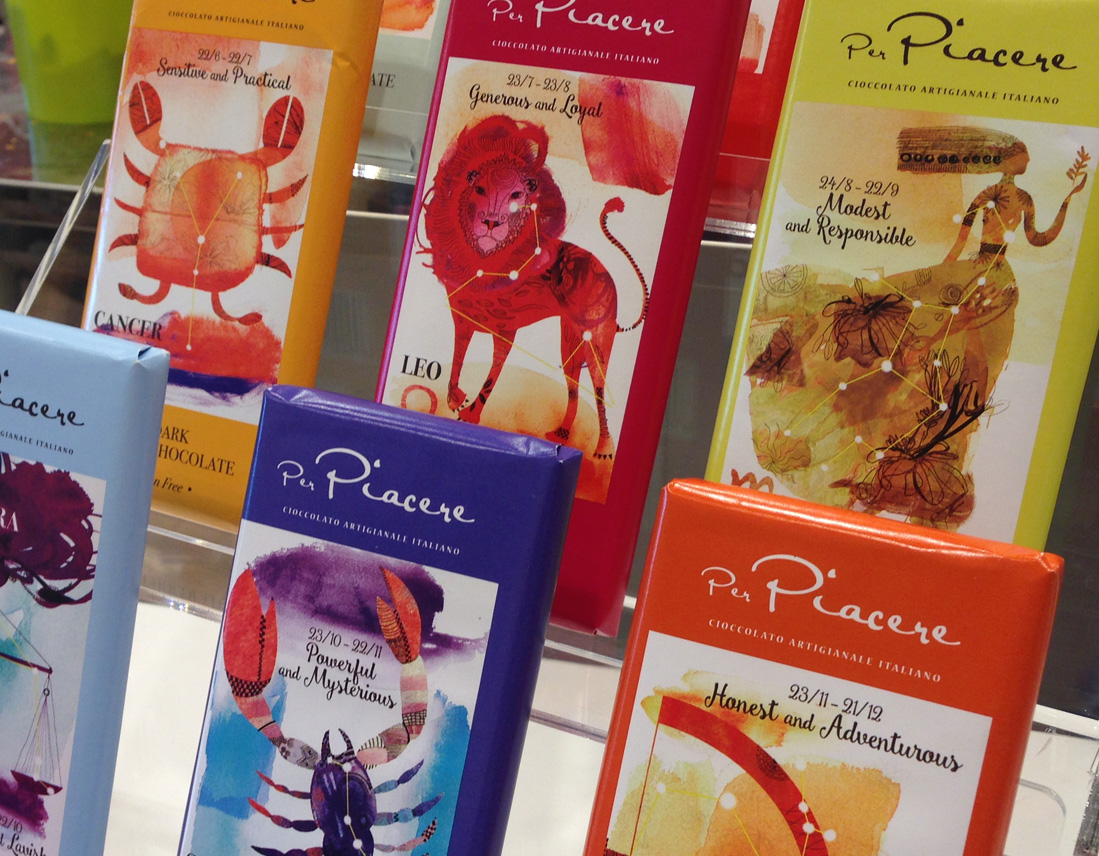 Per il packaging delle tavolette di cioccolato, destinate a una catena di supermercati di lusso nel mercato cinese, abbiamo scelto il tema dei segni zodiacali sapientemente illustrati dalla bravissima Alessandra Scandella.