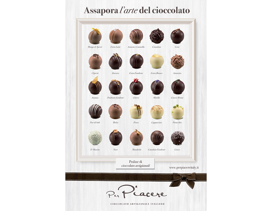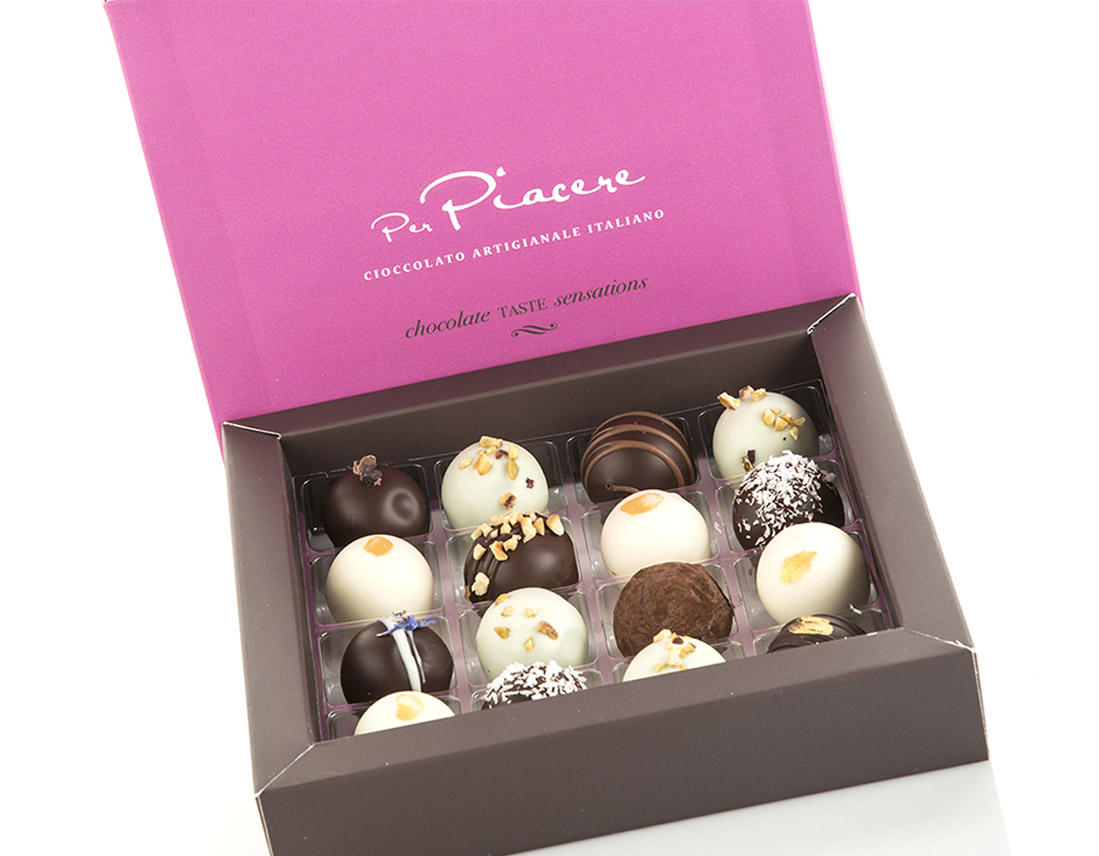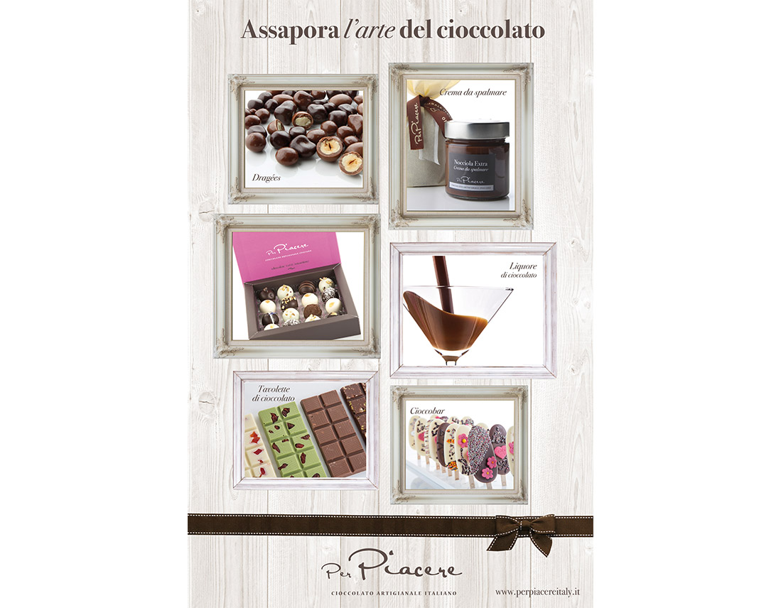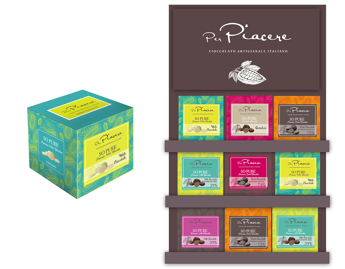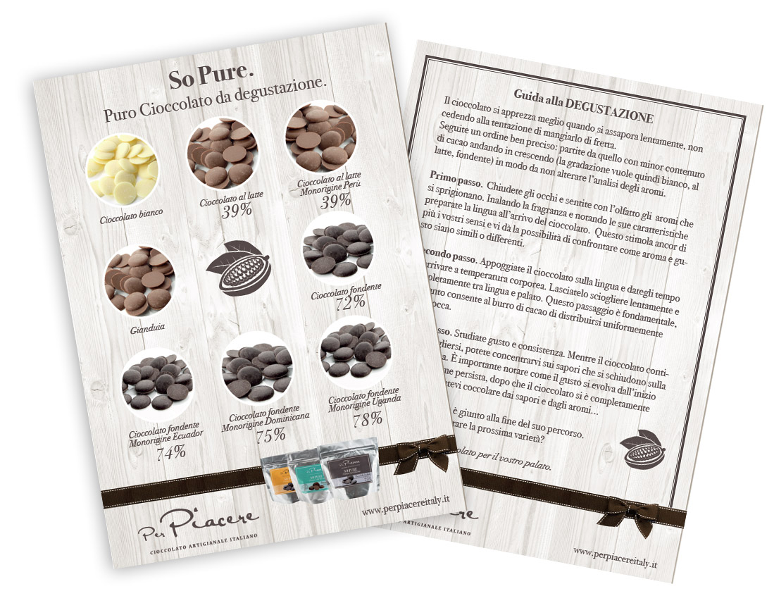 Brand Identity e Packaging design per Per Piacere, cioccolateria artigianale che propone prodotti di cioccolato creativi di alta qualità.